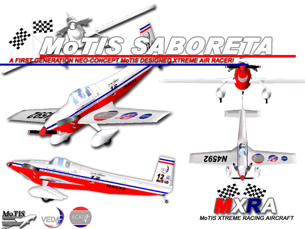 The SABORETA is a three version build of a great neo concept racing aircraft that MoTIS engineers have designed to represent MoTIS and its subsidiaries in future air races. This version of the SABORETA is the test prototype version 1AXR and is subject to changes after intensive flight testing. This aircraft will be made available to the simulating community at large after testing and VEDA certification.