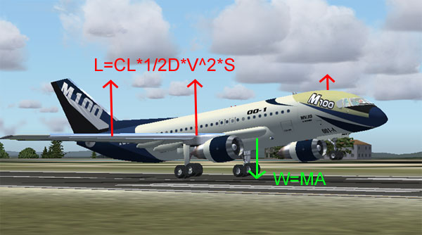 As take off is a lesson in turning horizontal engine thrust=F=M*A with forward flight into lift=L =CL x(1/2density)V Squared x S, by reduction in air pressure by increasing air velocity over the concept wing structure, this make lift and the negative force called W, is canceled in a process known as dynamic equilibrium of opposing forces! Of course in the aircraft CFG its a simple matter of code alteration but this is how it works in the real world and is simulated in general!