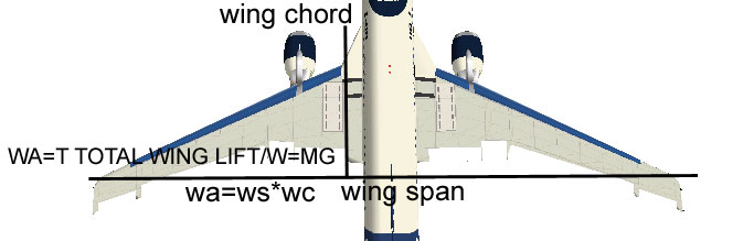 Like so: WG=WE + WF +WP, W/S=WING LOADING RATIO. Knowing the wing to weight ratio for an aircraft sure dose help in deriving the proper design possibilities for an aircraft in question. S=W/(W/S). All of these equations have a major effect on the v speeds of an neo concept airliner as the speeds are directly related to the lift that is generated over the wings at take off that will lift the aircraft weight into the sky at the proper safety speed. The stall speed is really the